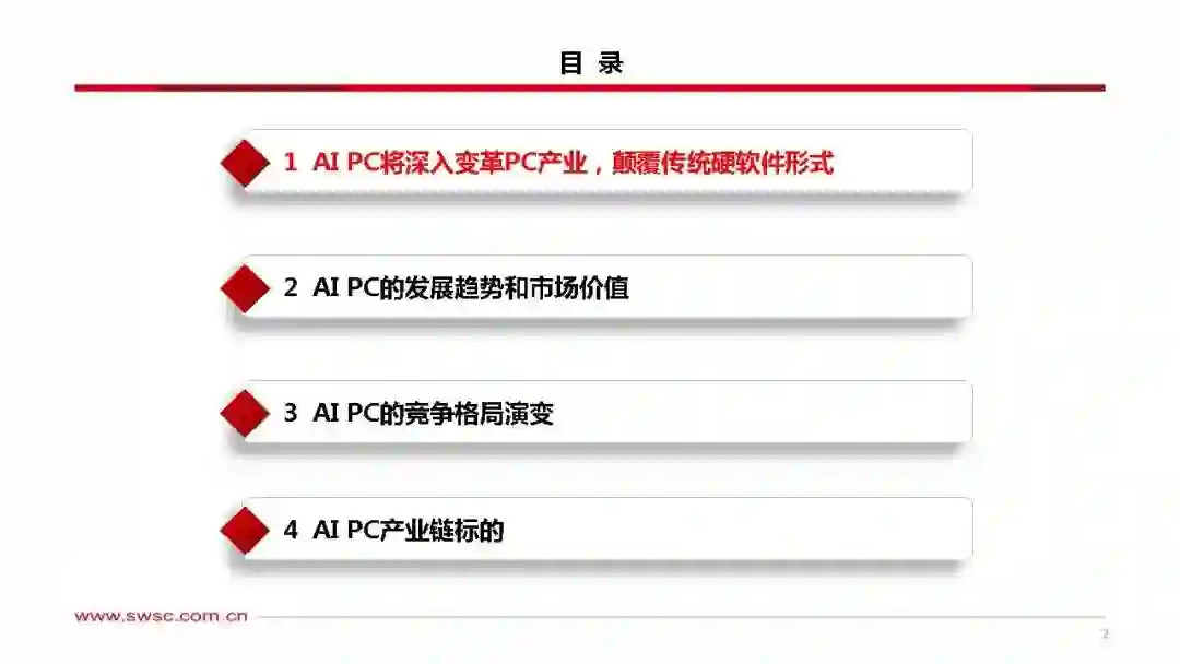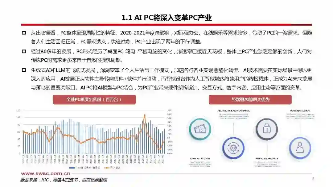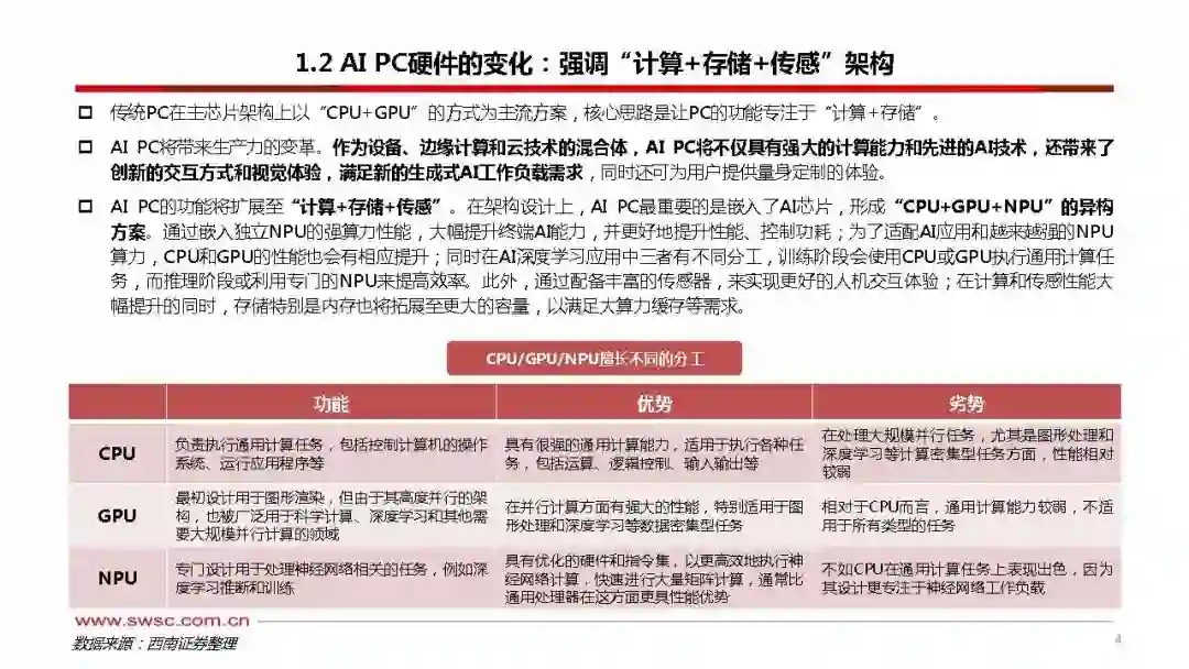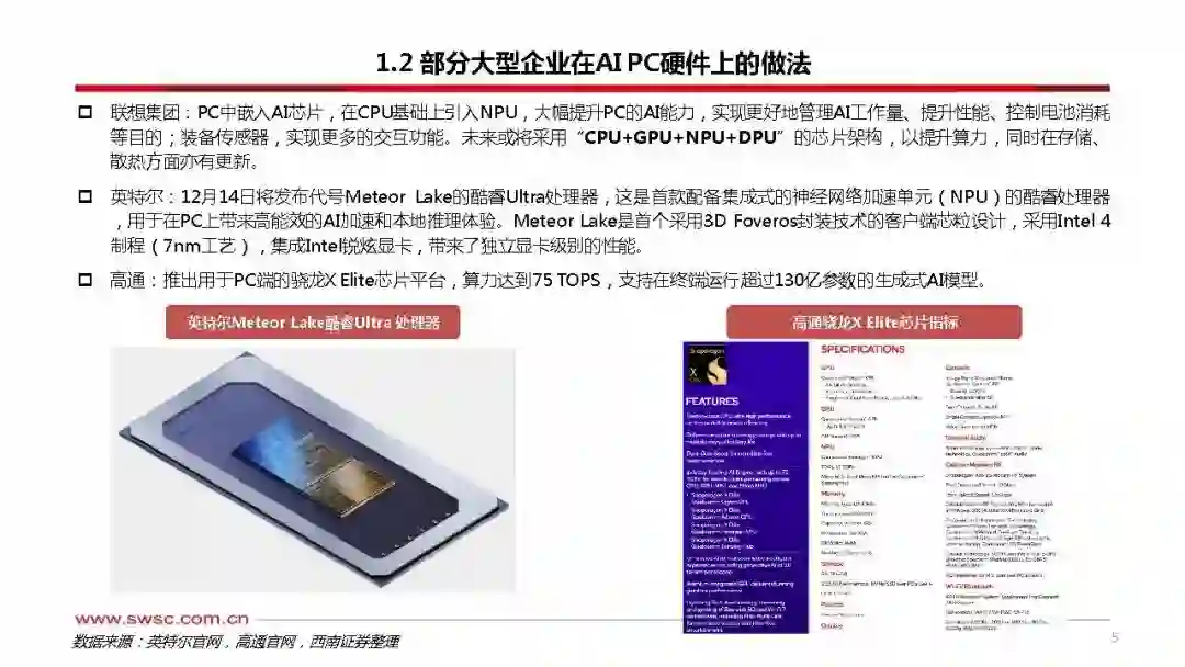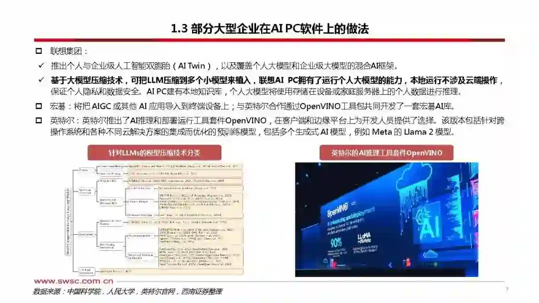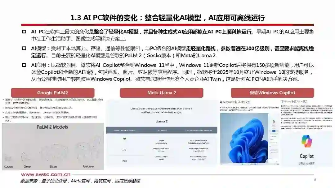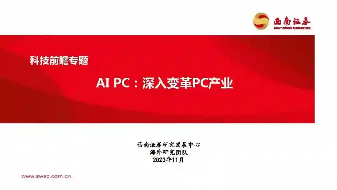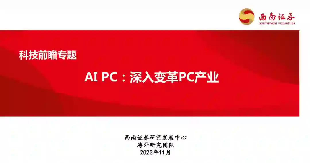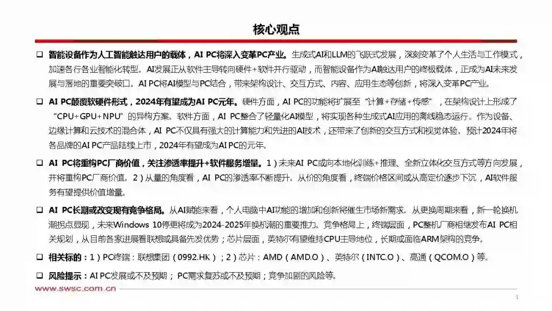 智能设备作为人工智能触达用户的载体,AIPC将深入变革PC产业。生成式AI和LLM的飞跃式发展,深刻变革了个人生活与工作模式,加速各行各业智能化转型。AI发展正从软件主导转向硬件+软件并行驱动,而智能设备作为AI触达用户的终极载体,正成为AI未来发展与落地的重要突破口。AIPC将AI模型与PC结合,带来架构设计、交互方式、内容、应用生态等创新,将深入变革PC产业。 AIPC颠覆软硬件形式,2024年有望成为AIPC元年。硬件方面,AIPC的功能将扩展至“计算+存储+传感”,在架构设计上形成了“CPU+GPU+NPU”的异构方案。软件方面,AIPC整合了轻量化AI模型,将实现各种生成式AI应用的离线稳态运行。作为设备、边缘计算和云技术的混合体,AIPC不仅具有强大的计算能力和先进的AI技术,还带来了创新的交互方式和视觉体验。预计2024年将各品牌的AIPC产品陆续上市,2024年有望成为AIPC的元年。 AIPC将重构PC厂商价值,关注渗透率提升+软件服务增量。1)未来AIPC或向本地化训练+推理、全新立体化交互方式等方向发展,并将重构PC厂商价值。2)从量的角度看,AIPC的渗透率不断提升。从价的角度看,终端价格区间或从高定价逐步下沉,AI软件服务有望提供价值增量。 AIPC长期或改变现有竞争格局。从AI赋能来看,个人电脑中AI功能的增加和创新将催生市场新需求。从更换周期来看,新一轮换机潮拐点显现,未来Windows10停更将成为2024-2025年换机潮的重要推力。竞争格局上,终端层面,PC整机厂商相继发布AIPC相关规划,从目前各家进展看联想或具备先发优势;芯片层面,英特尔有望维持CPU主导地位,长期或面临ARM架构的竞争。