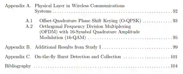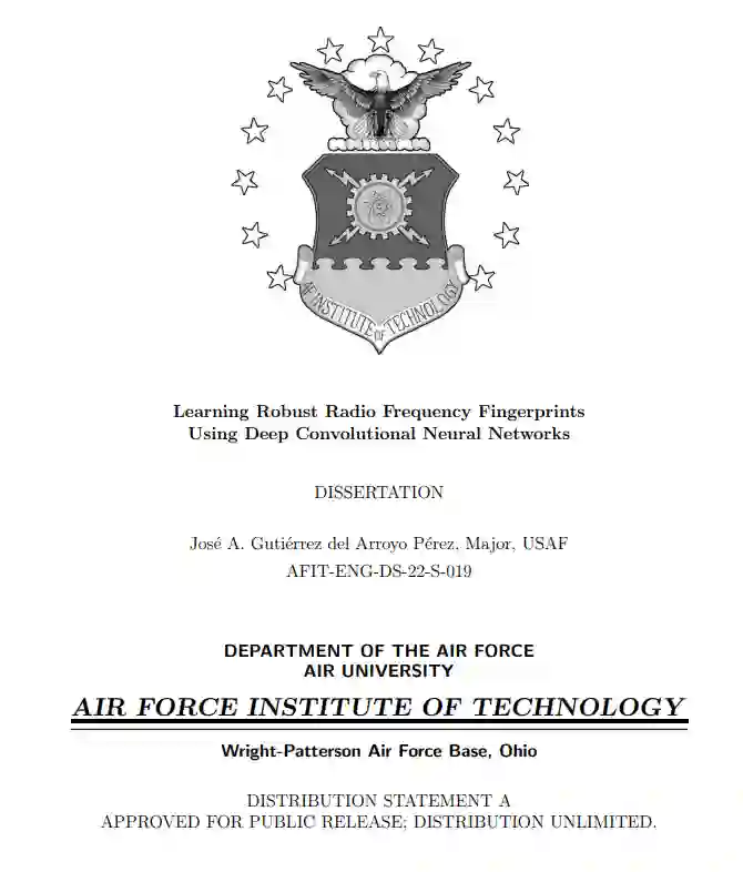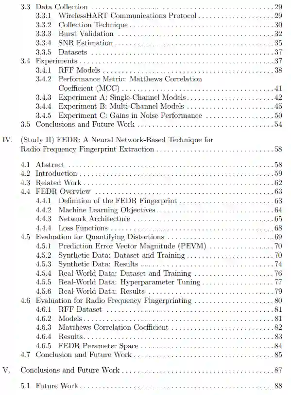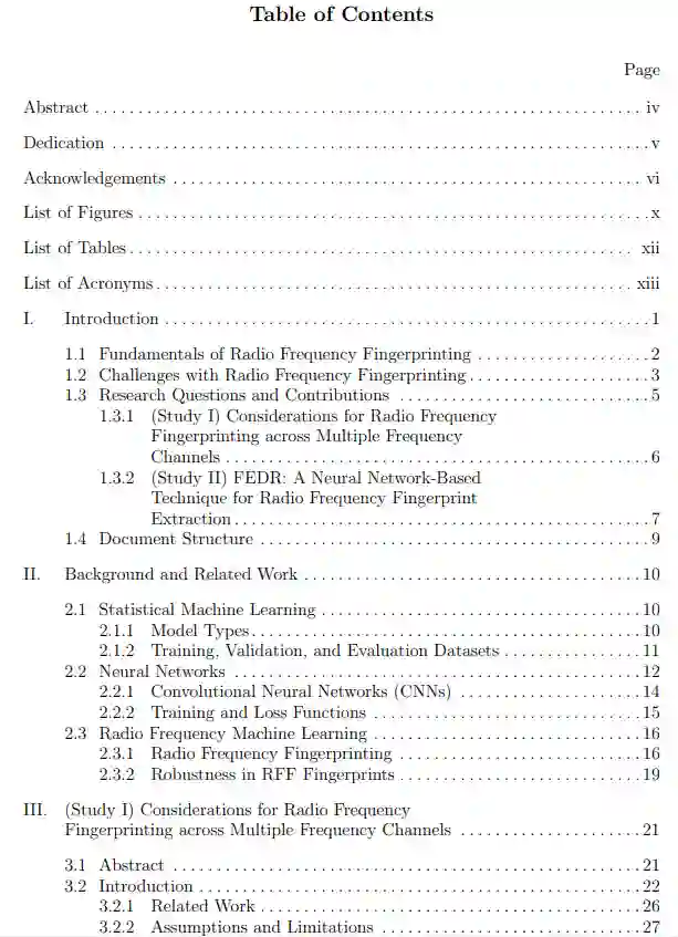 本文件围绕这两项主旨研究及其贡献展开。第2章提供了一个简短的背景,以提供跨越这两项研究的技术背景。这包括关于ML的基本信息,它在射频机器学习(RFML)中的应用,以及近期RFF研究的总结。研究一和研究二在第3章和第4章中作为独立的手稿呈现,每篇手稿的格式都与期刊出版物一致。这两章中的每一章都介绍了自己的相关介绍和相关工作,以及该相应研究的相关背景信息。第5章中总结了研究结论和未来的工作。