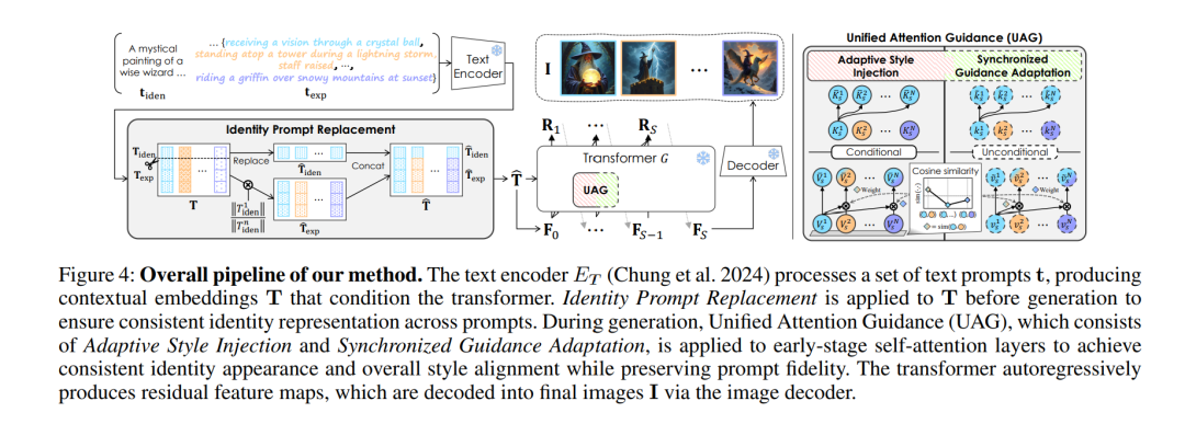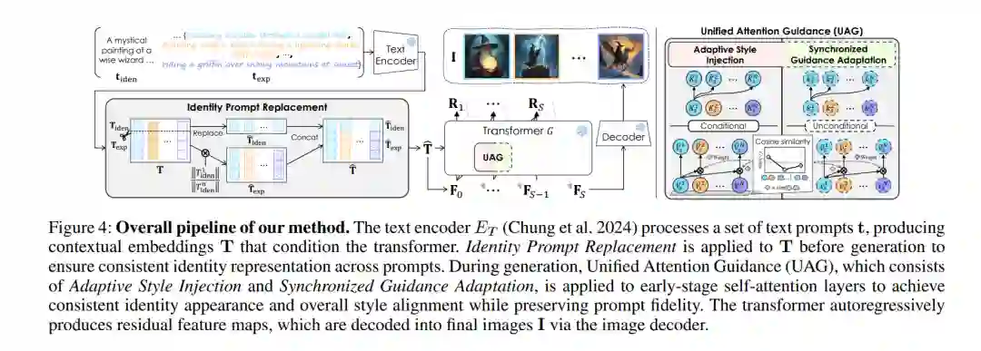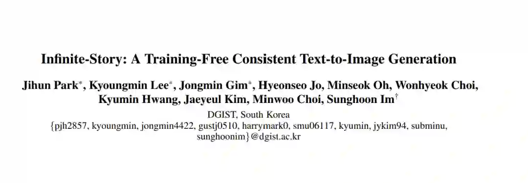 我们提出Infinite-Story,一个专为多提示词叙事场景设计的免训练连贯文本到图像生成框架。该方法基于按尺度自回归的生成模型,重点解决连贯文生图面临的两大核心挑战:身份不一致性与风格不一致性。为此,我们引入了三项互补技术:身份提示替换,通过减轻文本编码器中的上下文偏差来对齐多提示词间的身份属性;以及统一注意力引导机制,包含自适应风格注入与同步引导适配,二者协同工作以增强全局风格与身份外观的一致性,同时保持对各提示词语义的忠实度。与现有需要微调或推理速度缓慢的扩散模型方法不同,Infinite-Story完全在推理阶段运行,能够在多样化的提示词下实现高度的身份与风格一致性。大量实验表明,我们的方法在生成质量上达到了当前最优水平,同时相比现有最快的连贯文生图模型实现了超过6倍的推理加速(每张图像仅需1.72秒),充分凸显了其在现实视觉叙事应用中的高效性与实用性。
