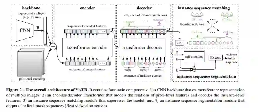 本文是第一个将Transformers应用于视频分割领域的方法。视频实例分割指的是同时对视频中感兴趣的物体进行分类,分割和跟踪的任务。现有的方法通常设计复杂的流程来解决此问题。本文提出了一种基于Transformers的视频实例分割新框架VisTR,该框架将视频实例分割任务视为直接端到端的并行序列解码和预测的问题。给定一个含有多帧图像的视频作为输入,VisTR直接按顺序输出视频中每个实例的掩码序列。该方法的核心是一种新的实例序列匹配和分割的策略,该策略在整个序列级别上对实例进行监督和分割。VisTR将实例分割和跟踪统一到了相似度学习的框架下,从而大大简化了流程。在没有任何trick的情况下,VisTR在所有使用单一模型的方法中获得了最佳效果,并且在YouTube-VIS数据集上实现了最快的速度。