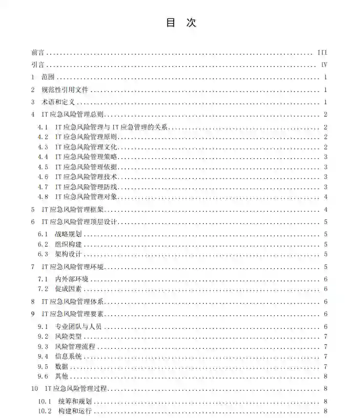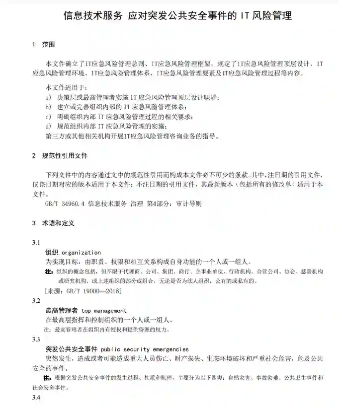 为有效控制突发公共安全事件下组织面临的IT应急风险,提高相应的IT应急风险管理能力,促进IT 对组织业务的安全、可靠、有效支持,提出应对突发公共安全事件下的IT风险管理规范,从而实现责任 落实、风险可控和价值实现的目标。 本文件确立了IT应急风险管理总则和框架,并规定了IT应急风险管理的顶层设计、环境、管理体系、 要素及管理过程等内容。实施主体应结合实施环境,构建管理实施过程,明确统筹和规划、构建和运行、 监督和评估、改进和优化的目标和基本任务。 各级各类组织的上级主管部门、监管机构等,可根据法律法规、部门规章的要求,使用本文件对所 管辖各类组织的IT应急风险管理提出要求,并进行监督。