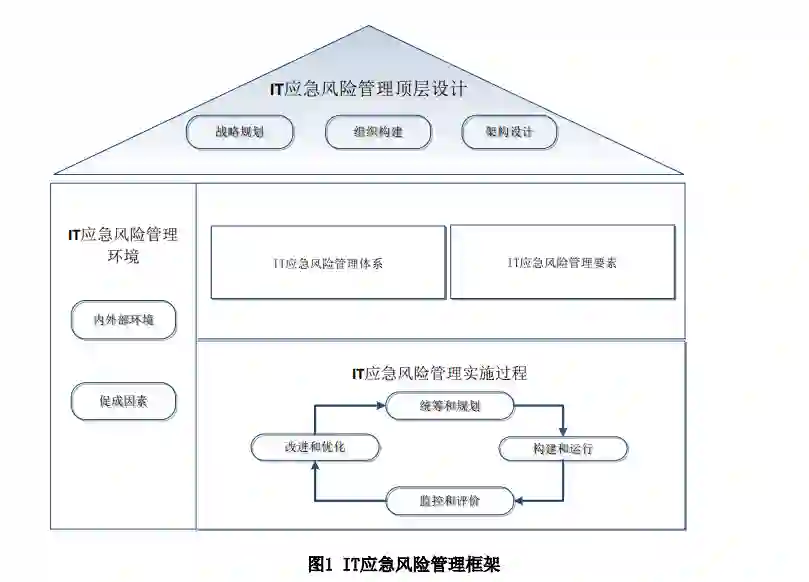 组织应按照IT应急风险管理框架建立IT应急风险管理体系。IT应急风险管理框架是组织IT总体风险 管理框架的有机组成部分,是组织应对突发公共安全事件的IT应急风险管理框架,主要包括IT应急风险 管理顶层设计、IT应急风险管理环境、IT应急风险管理体系、IT应急风险管理要素和IT应急风险管理过 程五大部分,见图1。IT应急风险管理顶层设计包含与IT应急风险管理相关的战略规划、组织构建和架构设计,决策层或 最高管理者通过评估、指导和监督对IT应急风险管理层进行管控。 IT应急风险管理环境包含内外部环境和促成因素,是IT应急风险管理实施的保障。IT应急风险管理域包含IT应急风险管理体系和IT应急风险管理要素,是IT应急风险管理实施的核 心。 IT应急风险管理实施过程包含统筹和规划、构建和运行、监控和评价以及改进和优化,是IT应急风 险管理实施的方法。