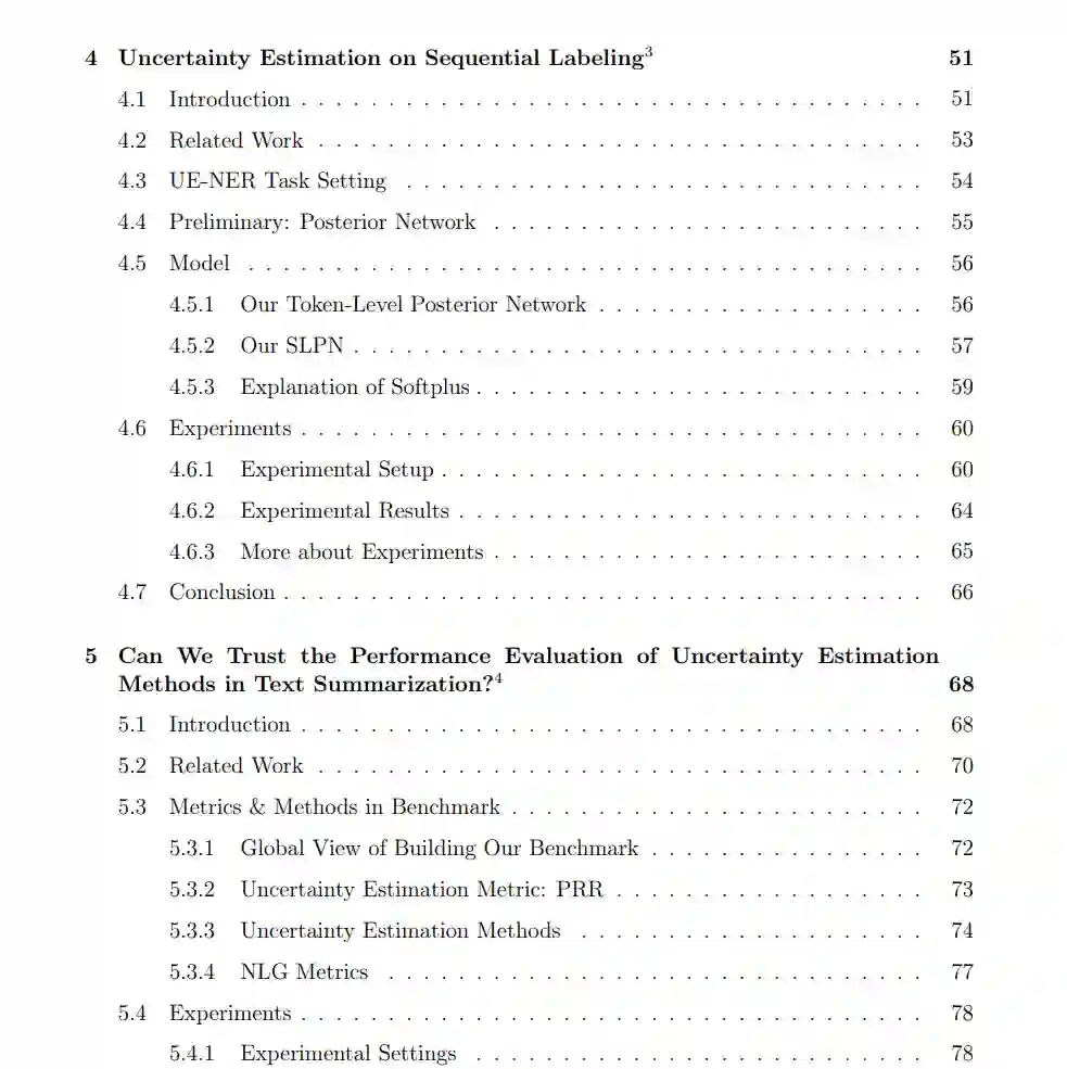 文本在我们的日常生活中扮演着至关重要的角色,涵盖了各种形式,如社交媒体帖子、新闻文章、书籍、报告等。因此,自然语言处理(NLP)受到了广泛关注。这项技术使我们能够执行诸如文本分类、实体识别,甚至在对话上下文中生成回复等任务。然而,尽管NLP的应用非常广泛,它经常需要做出一个关键决策:是否信任模型的预测。例如,一个最先进的模型被用来诊断疾病或评估谣言的真实性。在这种情况下,错误的预测可能会带来严重的后果,影响个人的健康或损害其声誉。因此,建立一种可靠的方法来评估NLP模型预测的可信度显得尤为重要,这也是我们关注的重点——NLP中的不确定性估计。尽管有许多研究涉及不确定性估计或NLP,但这两个领域的结合却较为罕见。这是因为大多数NLP研究侧重于模型预测性能,而往往忽略了NLP模型预测的可靠性。此外,当前的不确定性估计模型可能并不适用于NLP,因为NLP任务具有独特的特点,如命名实体识别中需要更细粒度的信息。因此,本论文提出了针对不同NLP任务的不确定性估计新方法,考虑了NLP任务的独特特点。NLP任务可以分为自然语言理解(NLU)和自然语言生成(NLG,如文本摘要)。在NLU任务中,理解可以从两个视角进行:全局视角(如文档级别的文本分类)和局部视角(如句子级别的自然语言推理和标记级别的命名实体识别)。因此,我们研究了三个任务的不确定性估计:文本分类、命名实体识别和文本摘要。此外,由于少样本文本分类最近备受关注,我们还研究了少样本文本分类中的不确定性估计。第一个主题是文本分类中的不确定性估计,少有的不确定性模型关注在人力资源参与的情况下提高文本分类的性能。为了填补这一空白,我们的研究重点是通过增强胜出分数的置信度来提高不确定性分数的准确性。我们引入了MSD,一种由三个不同组件组成的新模型:“混合增强”(mix-up)、“自集成”(self-ensembling)和“独特性分数”(distinctiveness score)。MSD的主要目标是通过减少胜出分数的过度自信问题,同时考虑各种类别的不确定性,来优化不确定性分数的准确性。该模型可以无缝集成到不同的深度神经网络中。我们在四个真实世界数据集上进行了广泛的消融实验,结果显示出持续的竞争性改进。我们的第二个主题是少样本文本分类中的不确定性估计(UEFTC),该领域中每个类别只有少数甚至只有一个可用的支持样本。UEFTC代表了一个未充分研究的领域,由于数据样本有限,UEFTC模型预测不确定性分数以评估分类错误的可能性。然而,传统的文本分类不确定性估计模型不适用于UEFTC,因为它们需要大量的训练数据,而UEFTC通常每个类别只有少量支持样本,甚至只有一个。为了应对这一挑战,我们提出了基于不确定性关系的对比学习(CLUR)作为UEFTC的解决方案。CLUR展示了在每个类别只有一个支持样本的情况下有效训练的独特能力,通过伪不确定性分数的辅助。CLUR的一个显著特点是其自动学习这些伪不确定性分数,与之前依赖手动指定的方法不同。我们对CLUR的四种模型结构进行了研究,评估了三种常用对比学习组件在UEFTC中的表现,结果显示其中两种组件的效果显著。我们的第三个主题是序列标注中的不确定性估计。序列标注任务包括对序列中的各个标记进行标注,以命名实体识别(NER)为例。尽管先前的研究在提高NER性能方面取得了显著进展,但NER中的不确定性估计(UE-NER)领域仍相对未知,但却至关重要。这个主题关注UE-NER,旨在评估NER预测的不确定性分数。以往的不确定性估计模型往往忽视了NER的两个独特属性:实体之间的相互关系(一个实体的嵌入学习依赖于其他实体)以及实体提取中错误跨度预测带来的挑战。为了解决这些问题,我们引入了序列标注后验网络(SLPN),设计用于在考虑其他标记的不确定性传播的同时,评估提取实体的不确定性分数。此外,我们制定了一种评价方法,以应对错误跨度案例的具体细微差别。我们的第四个主题是关于文本摘要中不确定性估计(UE-TS)的评估可靠性的一个被忽视的问题。文本摘要是自然语言生成(NLG)的一个关键任务,特别是在错误摘要可能带来严重后果的领域,如医疗保健中。由于错误摘要带来的潜在风险,UE-TS引起了关注。然而,评估UE-TS方法的可靠性引发了关注,因为不确定性模型指标与广泛的NLG指标之间存在相互依赖关系。为了解决这些问题,我们引入了一个综合性的UE-TS基准,涵盖了四个维度的26个NLG指标。该基准评估了两个大型语言模型和一个预训练语言模型在两个数据集上的不确定性估计能力。此外,它还评估了14种常见不确定性估计方法的有效性。我们的研究强调了使用多样的、不相关的NLG指标和不确定性估计技术以对UE-TS方法进行稳健评估的必要性。