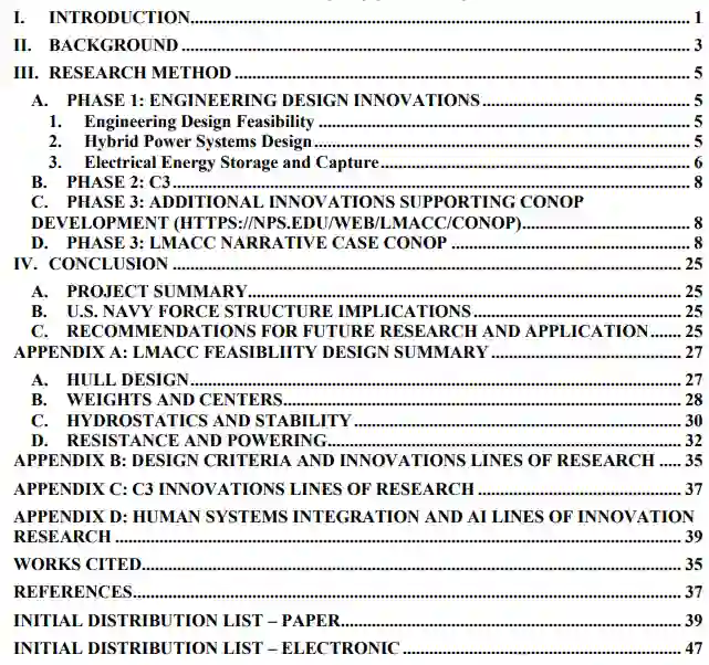 当前的海军兵力结构成本高昂且不可持续,需要大量人员,后勤保障体系庞大,并且数量不足,无法提供持续且显著的威慑。已有许多文章探讨混合舰队的概念(《Naval Engineers Journal》2023年3月刊)。全舰员配置或全自主运行似乎是目前考虑构建混合舰队的唯二选择。要打造完全无人的战舰并将其整合到现有的有人舰队及即将到来的无人平台中,必须解决许多具体需求。LMACC被设想为迈向混合舰队概念的一个演进且必要步骤。本研究项目提供了引入该小型战舰级别的概念性成果。本研究是对2019年初始项目的进一步深化。最初考虑了一个多准则模型,但设计是首要的,表明此类舰艇级别是可行的。本研究的成果对目前正在进行的2024年项目至关重要,旨在回答进一步的分析问题。