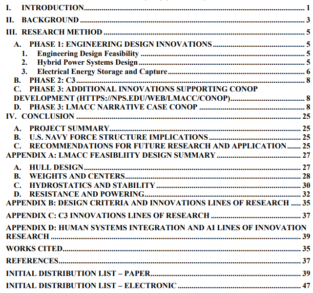 美军认为当前的海军兵力结构无法满足这一新概念的需求。本研究项目介绍了引入一种小型舰艇级别——“低人员配置自动化作战能力”(LMACC)的分析结果,该舰艇是始于2019财年的一项海军研究项目的概念设计产物。现在需要回答的问题包括:推进该设计,并将其作战概念纳入所需的作战领域(水雷战(MIW)、反水雷措施(MCM)、远征前进基地作战(EABO)、海军陆战队滨海团(MLR)支援以及水下战(USW)的轻型后勤保障)。所有这些都需在为支队作战增强的攻防武器能力范围内实现。本研究探讨了必要的设计、作战与创新。