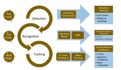 当这一层检测到匹配时,第二层就会在短时间内(如约 240 毫秒[3])通过连续采样进行识别。识别阶段的目标是区分异常声音是否与飞越音频传感器网络的无人机有关,并最终确定其类型。我们将研究两种主要方法:一些作者在 [1] 中提出的方法和循环神经网络 (RNN) [6]。第二识别层中的正匹配将启用第三阶段的跟踪算法。在这一阶段,发出警报的节点(在识别阶段匹配成功的节点)会唤醒邻居节点,以执行波束形成跟踪。这是耗电量最大的阶段,因为需要维护音频传感器网络与其远程控制中心之间的通信链路,以及音频传感器的连续采样阶段。
