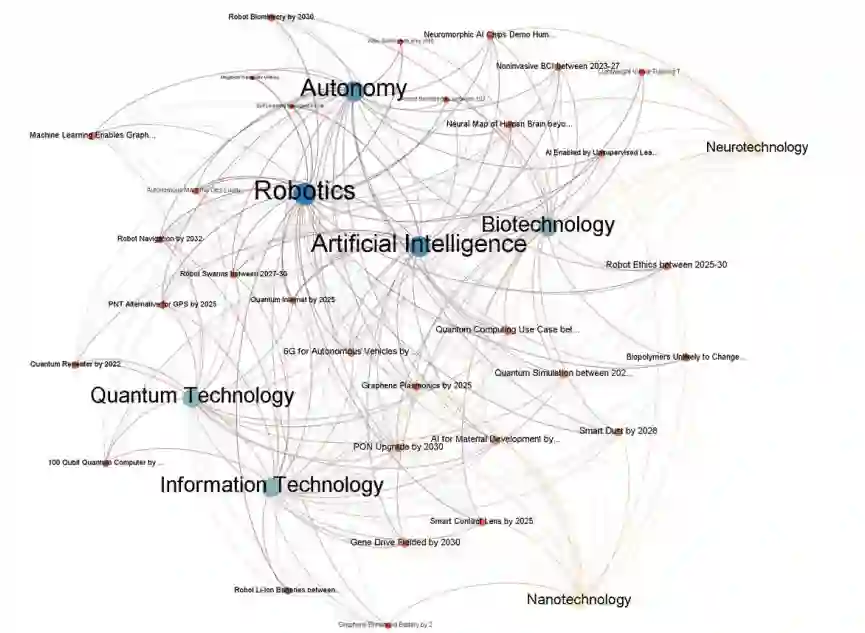 研究小组注意到,31 项创新的无限制融合有可能产生 1.7069174e+46 种可能的结果。尽管如此,在使用名义组技术、时间序列分析、网络分析和直觉进行分析的基础上,团队将结果缩小到了他们最有信心的六种融合,这些融合符合三个目标:重要、军事相关和发生在 2035 年或之前。