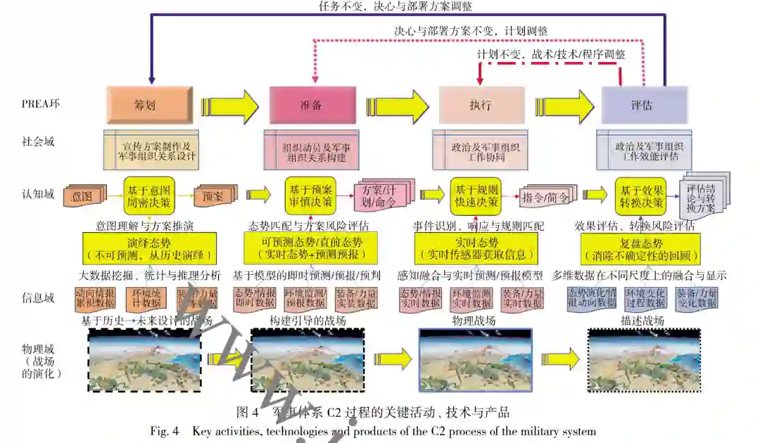 自 1943 年美国神经科学家麦卡洛克(Warren McCulloch)和逻辑学家皮茨(Water Pitts)建立神经元 的数学模型以来, 人工智能的发展可谓是“过山车”, 既有符号主义、联结主义(神经网络)学派掀起的高 潮, 也有专家系统带来的困境和徘徊, 人工智能的孕 育过程跌宕起伏. 2018 年, 一种全新的学习训练方 法——预训练为深度学习打开了一扇智慧之门. 预 训练成功激活了深度神经网络对大规模无标注数据 的自监督学习能力, 在图形处理器(graphics process原 ing unit, GPU)算力和海量无标注文本数据的双重加 持下, 实现深度学习模型规模与性能齐飞, 成为人工 智能领域的革命性突破. 围绕 LSPTM 在海量数据、并行计算和模型学习 能力方面等展开的“军备竞赛”日益白热化. 2023 年, OpenAI 发布的预训练多模态模型 GPT-4 已经达到了万亿级参数量的惊人训练规模, 其智能在各种职 业和学术考试上的表现与人类水平相当. 马克思认为科学技术是军事发展中最活跃、最 具革命性的因素, 每一次重大科技进步都深刻影响 着世界军事发展走向, 引发战争形态和作战方式的 重大变革[1] . 超大规模预训练模型带来的人工智能的 技术突破将导致什么样的军事变革?本文深度剖析 LSPTM 的发展历程、科学原理、关键技术及涌现功 能, 以军事体系的关键要素——指挥与控制为对象, 以 C2 过程的基本范式和运行模式框架为指导, 从物 理域、信息域、认知域和社会域, 全维分析 LSPTM 的应用场景, 阐述 LSPTM 实现人工智能突破给 C2 领域发展带来的机遇和挑战.