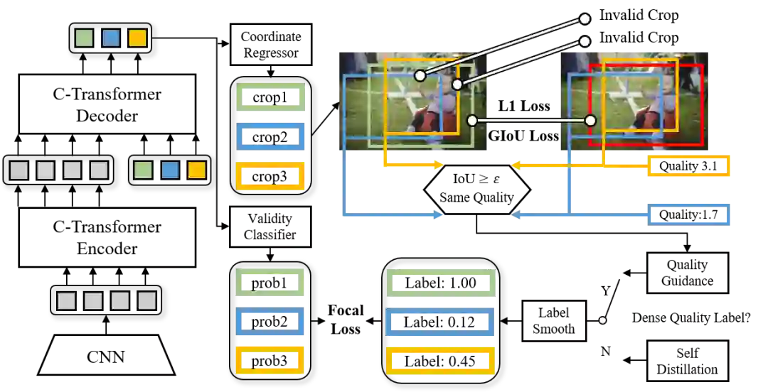图像裁切是一种简单有效的可以提升图像构图美感的方式。现有的两类模型,候选裁切评估模型和裁切坐标回归模型,都有明显的缺陷。候选裁切评估模型难以遍历所有高质量裁切,无法满足全局性要求;而裁切坐标回归模型则只能输出一个裁切结果,忽视了多样性。针对全局性和多样性不能兼得的问题,我们提出了一种基于软标签集合预测的图像裁切模型。模型使用一组固定数量的可学习锚通过条件Transformer网络回归多个裁切。回归裁切与真实裁切进行二分图匹配,匹配结果用于训练一个辅助的有效性分类器,使模型可以从所有预测中挑选有效子集。为了缓解有效性分类硬标签与无效裁切的真实质量之间的不一致性,我们进一步提出了两种标签平滑策略。第一种基于裁切的局部冗余性对质量分数进行直接估计并映射为软标签;第二种使用自蒸馏策略进行自主平滑。两种策略分别适用于密集标注和稀疏标注的数据集。我们的模型在两个版本的GAIC数据集和FLMS数据集上均取得突出效果,同时克服了两类传统模型的缺陷,能够对图像进行全局遍历并找出多个高质量裁切。更加适用于真实场景的应用。