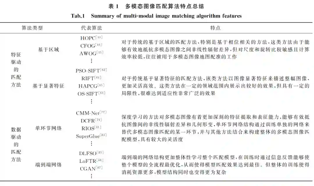 多模态图像匹配方法根据数据源角度可以分 为:可见光与 SAR 图像匹配、可见光与红外图像 匹配、红外图像与 SAR 图像匹配、可见光与多光谱图像匹配、遥感图像与 GIS矢量匹配、遥感图 像与视频数据匹配、遥感图像与三维点云匹配. 根据传感器平台可以分为:卫星影像与航空影像 匹配、航空影像与地面照片匹配、卫星影像与地面 照片匹配[19].一般认为,多模态图像匹配方法是 在传统的图像匹配方法基础上发展起来的,可划 分为基于特征驱动的匹配方法和基于数据驱动的 匹配方法.以时间脉络为序,多模态图像匹配方 法主要包括以下3个典型的发展阶段(图2): (1) 萌芽期(1970—1990 年).最初的图 像 匹配是利用相关系数实现,通过计算图像中选定 的模板区域的相似性,从中构建图像之间的匹配 关系.把图像信号最为相似的区域称为同名区 域,同名区域的中心点称为同名点,这就是最初相 关系 数 图 像 匹 配 基 本 原 理,也 称 之 为 模 板 匹 配 (templatematching),现有图像匹配方法基于模 板匹配雏形发展而来.在该类匹配算法中常用的 相似性度量函数包括差方和(SSD)、归一化互相 关(NCC)、互信息(MI)和相位相关(PC)等[20G22]. 最初学者们发现,一般 SSD、NCC 和 PC 受非线 性灰度畸变的影响很大,难以应用于多模态图像 匹配.互信息(MI)被证明在一定程度上能够抵 抗非线性灰度畸变,能适用于多源图像匹配中,但 具有较高计算量.