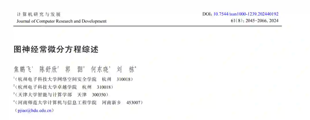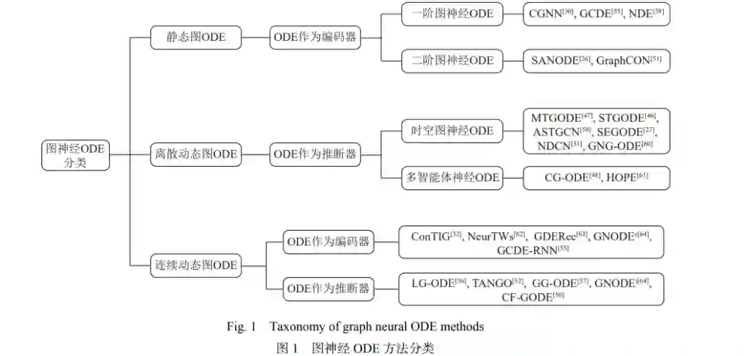 图神经网络(graph neural network,GNN)是处理图结构数据的强大工具,能够捕捉节点间的复杂关系和特征. 但GNN的离散架构导致其在表示图结构、建模图演化、适应不规则数据和计算开销等方面面临诸多挑战. 面对这些挑战,神经常微分方程(ordinary differential equation,ODE)由于能够模拟系统状态的连续变化,具备“连续深度”的编码和推断能力,被作为解决GNN面临挑战的全新方法而引入. 然而,神经ODE是为欧式结构数据设计的,无法直接捕捉图结构特性. 因此,提出了图神经ODE,一种将神经ODE与GNN结合的新架构,可以更好地适应图结构数据并充分利用其特性. 近年来,图神经ODE相关研究已经深入到图机器学习的各个方向中,引发了新的研究热潮. 在此背景下,适时地对图神经ODE研究前沿进行了系统性综述. 首先,回顾了GNN的关键优势和面临的诸多挑战,阐述了引入神经ODE并与GNN结合的理论基础和实践意义. 随后,详细介绍了图神经ODE的背景和基本概念,并提出了一种新颖的分类方法,在此基础上对当前的相关方法进行了全面描述. 然后,介绍了相关研究常用的验证方法,包括下游任务及数据集. 进一步,深入探讨了图神经ODE在多个实用领域上的应用. 最后,对图神经ODE面临的挑战和未来发展趋势进行了总结和展望.