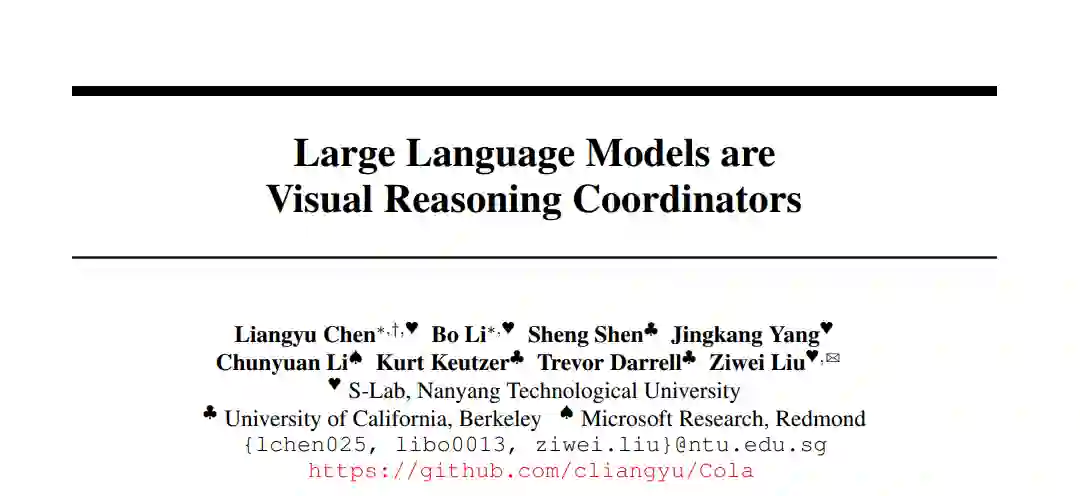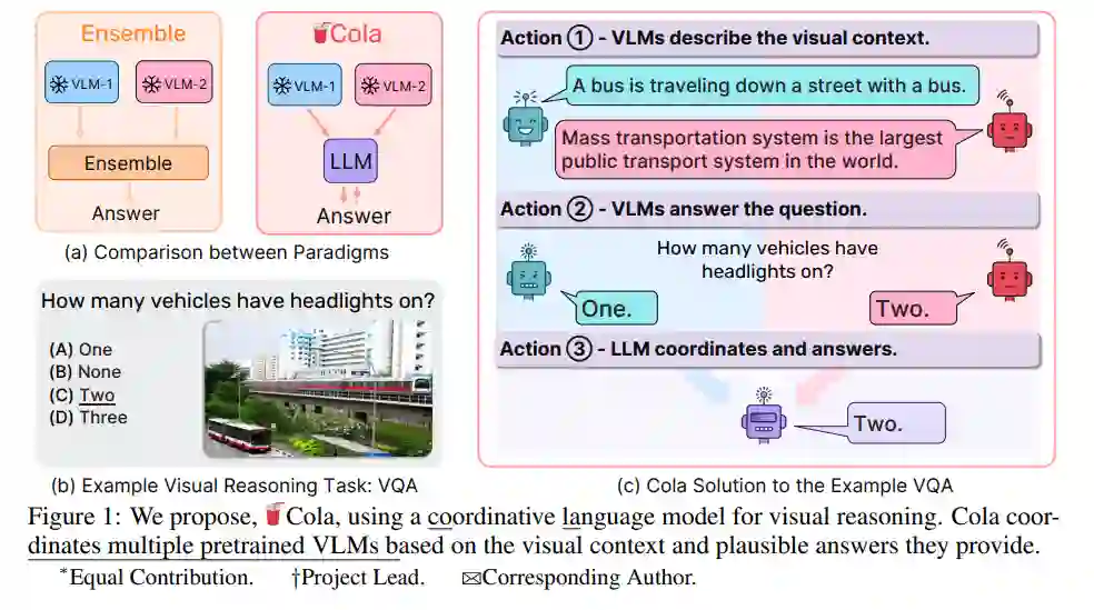 视觉推理需要多模态感知和对世界的常识认知。近期,有多个视觉-语言模型(VLMs)提出,它们在各个领域都表现出出色的常识推理能力。但如何利用这些互补的VLMs的集体能力却鲜有探讨。现有的方法,如集成,仍难以以期望的高阶通信来聚合这些模型。在这项工作中,我们提出了一种新的范例Cola,用于协调多个VLMs进行视觉推理。我们的关键见解是,大型语言模型(LLM)可以通过促进自然语言通信来有效地协调多个VLMs,利用它们的独特和互补能力。大量实验表明,我们的指令调整变体,Cola-FT,在视觉问题回答(VQA),外部知识VQA,视觉蕴涵和视觉空间推理任务上都达到了业界领先的性能。此外,我们证明,我们的上下文学习变种,Cola-Zero,在零和少样本设置中表现出竞争性的性能,无需微调。通过系统的消融研究和可视化,我们验证了协调器LLM确实理解了指令提示以及VLMs的单独功能;然后协调它们,实现了令人印象深刻的视觉推理能力。