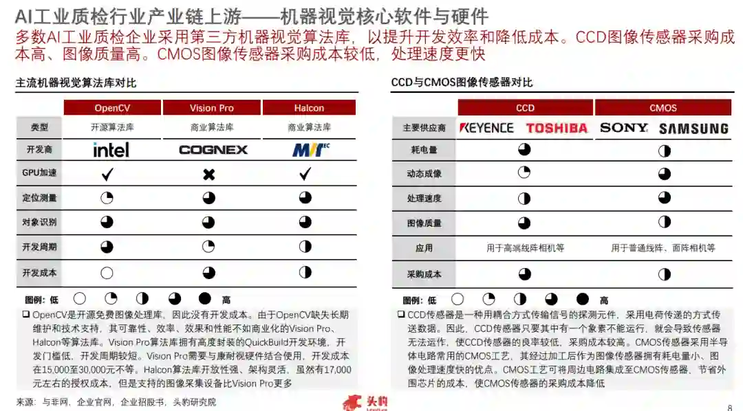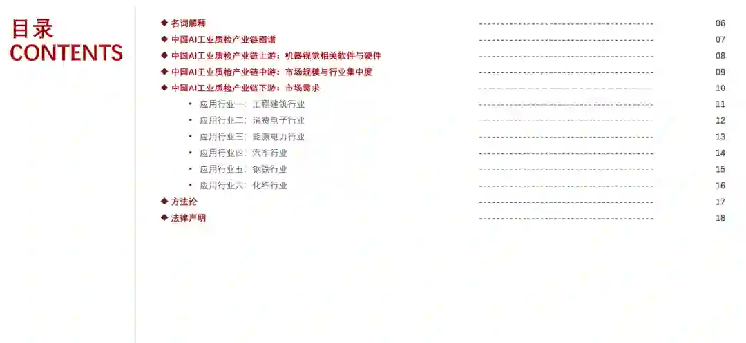 机器视觉为各行业集成应用和服务,其中包括了基于机器视觉发展的AI工业质检行业。AI工业质检技术作为机器视觉的应用层,其主要运用了机器视觉的算法库、光学器件以及图像传感器。AI工业质检已成为机器视觉在制造业的重要应用之一,推动中国制造业的智能化发展 02制造业人工智能解决方案市场规模上升,AI工业质检行业发展向好 中国制造业人工智能解决方案的市场规模呈现快速增长的态势,2017至2021年的年复合增长率为97.2%。云厂商、机器视觉厂商、AI创新技术厂商纷纷进入AI工业质检赛道,已在AI工业质检领域积累了多个细分领域案例。随着AI工业质检技术在各领域渗透率的不断提高,制造业人工智能解决方案市场规模将持续上升,预计2021至2026年的年复合增长率为45.6%。当前中国AI工业质检行业集中度较低,百度智能云、创新奇智、华为云、阿里云占据了41.5%的市场份额,AI工业质检赛道仍有入场机会 03AI工业质检覆盖多个制造行业,为行业内企业降本增效 AI工业质检主要涉及到产品外观缺陷、尺寸、平整度、距离、校准、焊接、质量、弯曲度等检测。AI工业质检结合机器视觉和神经网络算法,实现从人工设计特征和规则到AI从大量数据中自动学习的突破。AI工业质检能够根据成像环境和缺陷轻微变化自动调整阈值和算法,进而提高制造业企业的质检效率,降低人力使用成本,帮助制造企业实现降本增效