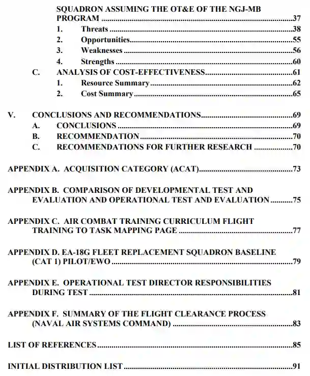 优势、劣势、机会和威胁(SWOT)分析研究了下一代干扰器(NGJ)项目在速度、成本和性能方面的优势或劣势,并考虑了舰队作战节奏(OPTEMPO)和优化的舰队反应计划(OFRP)。此外,SWOT分析评估了现代舰队中队作为 "卓越的作战力量"(NAE,2014年,第4页)部署的操作限制,处理资源、VAQ准备标准、培训、空勤人员战术专长和安全管理,可能承担采购类别(ACAT)一级项目的操作测试者的角色。