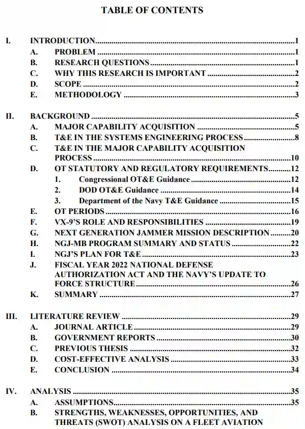 本研究的目的是分析将下一代中波段干扰器(NGJ-MB)项目的作战测试和评估(OT&E)作用从第九航空测试和评估中队(AIRTEVRON NINE;VX-9)的OT&E中队转移到舰队航空电子攻击中队的潜在优势、劣势和成本、进度和性能的风险。研究了现代海军航空企业(NAE)中队作为作战力量的一部分部署对抗同行对手的行动限制,以确定NGJ-MB项目成功OT&E的风险。我的方法包括检查舰队的行动节奏和海军的优化舰队反应计划的调度、资源配置、训练、熟练程度、战术专长和管理。通过优势、劣势、机会和威胁分析,然后是成本效益分析,来分析与VX-9相比测试执行和报告的风险。在研究结论中,建议为NGJ-MB项目执行OT&E的更有利、更有效的路径。对NGJ-MB项目的成本、进度和性能所造成的后果,使人们对舰队航空中队不应该被赋予执行OT&E的任务有很高的信心。VX-9应该得到适当的资源、资金和海军的支持,以评估NGJ-MB吊舱的作战效能和适用性。