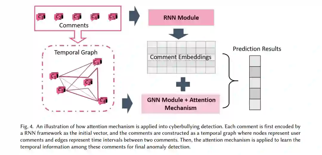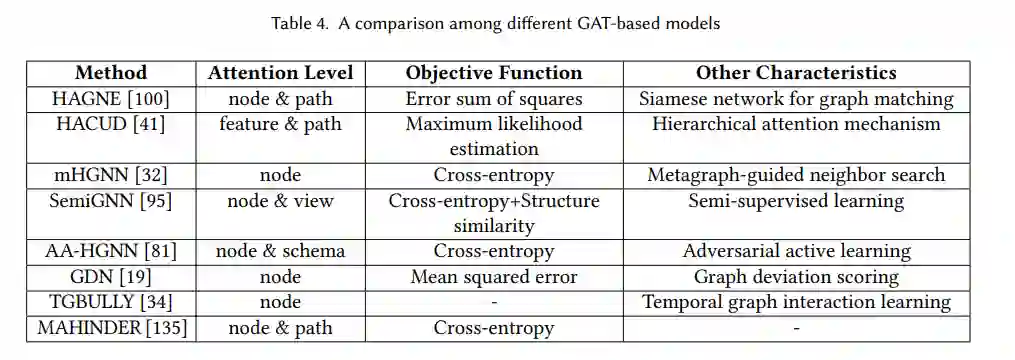 在深度图模型中,节点邻居的权重被定义为相等或默认设置。然而,邻居的重要性往往因属性和结构特征的不同而不同。受注意力机制的启发,Velivckovic等人[92]将注意力机制应用于GCN的空间卷积操作,提出了一种图注意力网络(GAT)。图4展示了注意力机制如何应用于网络欺凌检测的一个简单示例。在本节中,我们总结并介绍了使用图注意力网络的异常分析算法。该方法按照异常类型分为2个子检测,即节点异常检测和(子)图异常检测。表4总结了这些方法的主要特征。