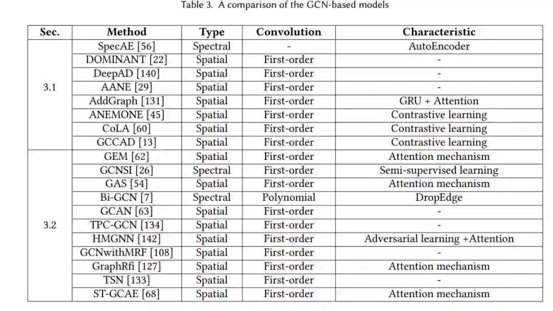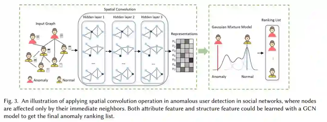 作为深度图模型中最流行的结构,图卷积网络(graph Convolutional Networks, GCNs)可以通过卷积操作学习和生成节点嵌入,即从节点的局部邻域聚合信息的过程。在本节中,我们介绍基于GCN的异常检测和预测方法,这也是所有异常分析模型中最流行的模型类型。根据方法是否针对特定异常检测任务设计,将其分为两类,即通用模型和任务驱动模型。图3展示了如何使用空间卷积操作检测社交网络中的异常用户的玩具模型。表3总结了这些方法的主要特点。