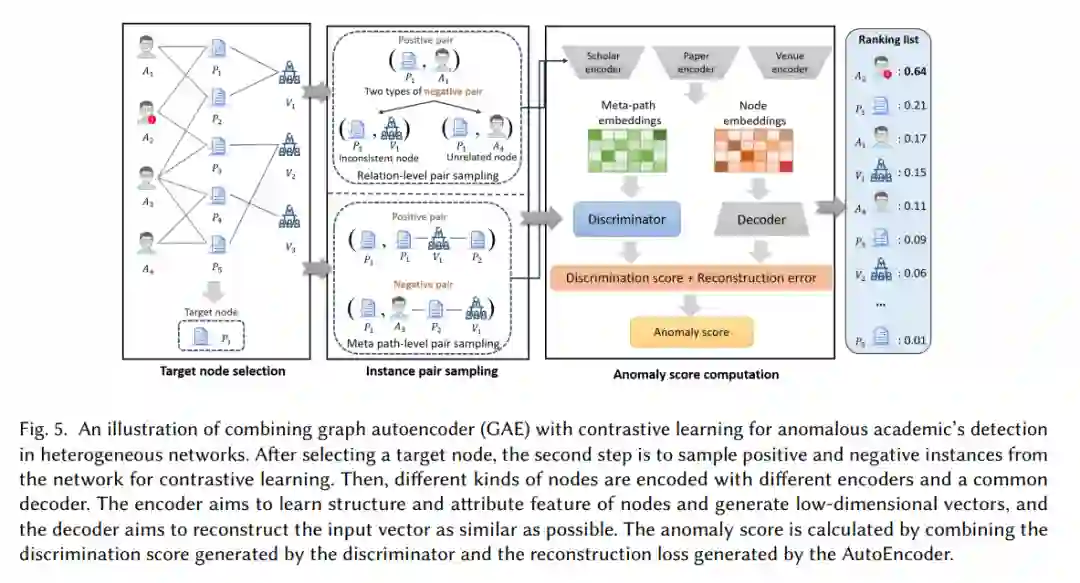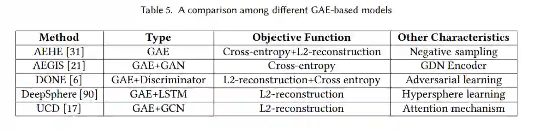 图自动编码器(GAE)是一种用于生成低维表示的无监督结构,目的是最小化编码器的输入和解码器的输出之间的损失[91]。在本节中,我们将介绍应用于异常分析的基于GAE的算法。根据训练和学习模式的不同,将这些方法分为3类,即通用自编码器、对抗训练和超球学习。表5总结了这些方法的主要特点。在图5中,我们提出了一个基于GAE的异质网络异常引用行为检测模型