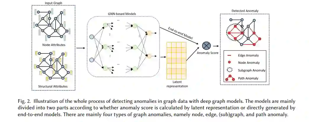 本综述的其余部分结构如下。第2节介绍图学习模型的表示法和初步知识,这些知识将在后续章节中使用。第3 ~ 6节将介绍异常分析方法。在第7节中,我们概述了可以用深度图模型解决的异常分析的几个实际应用,并在第8节中讨论了一些未来的研究方向和挑战。最后,我们在第9节简要总结了这个综述。