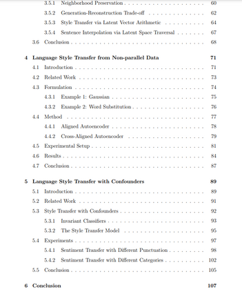 最后两章讨论了在没有监督数据的情况下的语言风格迁移。我们首先将非并行风格迁移的任务形式化,并讨论学习问题的可行性。我们提出了一种利用潜在表示的分布对齐来执行样式传输的方法。然后,我们研究了混杂因素,并表明通过将数据分为两组不同的风格,每组中的集合说明了我们不希望改变的变化,我们可以利用不变性来隔离混杂因素,并向所需的方向转移文本。