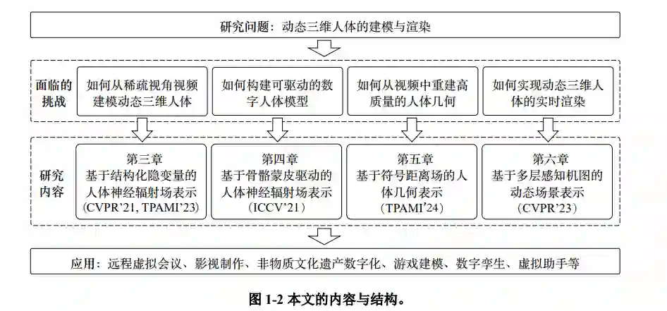 基于多视图几何理论与深度学习方法相结合的思想,本文提出了一系列面向结构化建模与渲染的隐式神经表示方法,致力于解决稀疏视角视频重建、可驱动人体模型、几何表面重建、实时渲染等可入人体建模领域的关键问题,实现了从稀疏视角视频中创建高质量的可驱动人体模型。本文主要的研究成果如下: