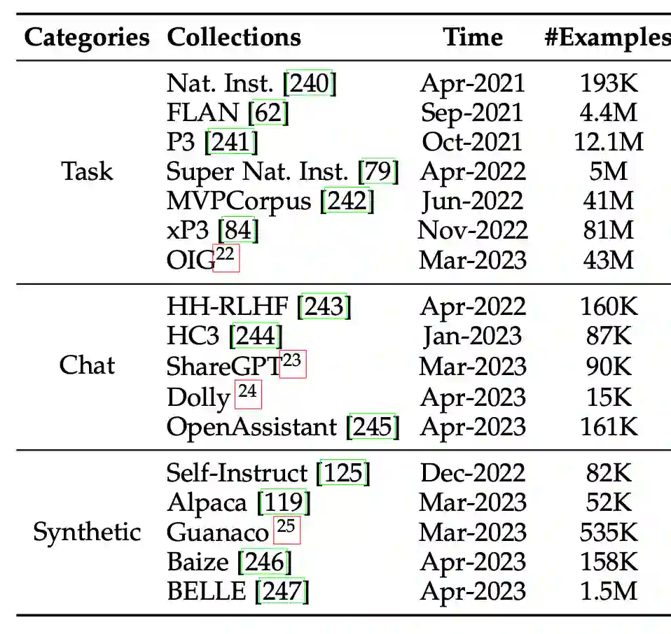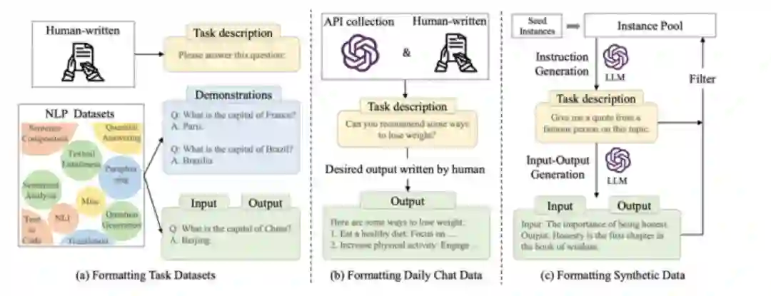 在适配技术章节,我们扩充了指令微调的技术细节,包括指令收集方法、指令微调的作用、指令微调的结果和对应分析。首先,我们按照任务指令、聊天指令、合成指令三类分别介绍了指令数据的收集方法,并收集了的指令集合。