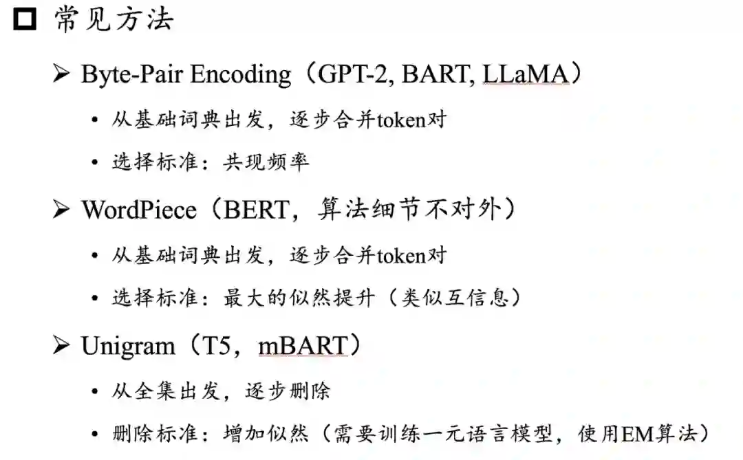 针对预训练数据的词元化问题(tokenization),我们补充介绍了BPE、WordPiece和Unigram三种常用算法: