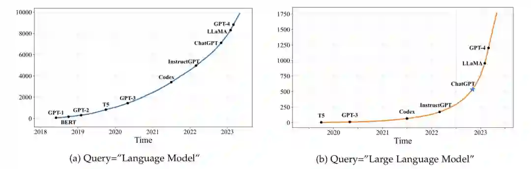大语言模型目前已经成为学界研究的热点。我们统计了arXiv论文库中自2018年6月以来包含关键词"语言模型"以及自2019年10月以来包含关键词"大语言模型"的论文数量趋势图。结果表明,在ChatGPT发布之后,相关论文的数量呈现出爆发式增长,这充分证明大语言模型在学术界的影响力日益凸显,吸引了越来越多的研究者投入到这一领域。