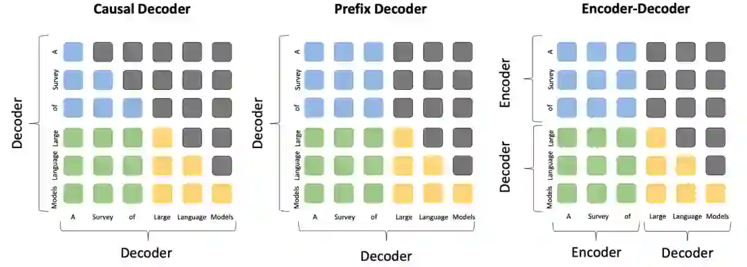 在预训练技术章节,我们大幅补充了大模型预训练各方面的技术细节。在模型架构部分,我们补充了三种主流模型架构的对比图,包括因果编码器、前缀解码器和编码器-解码器架构,从而直观的展示这三种架构的差异和联系。