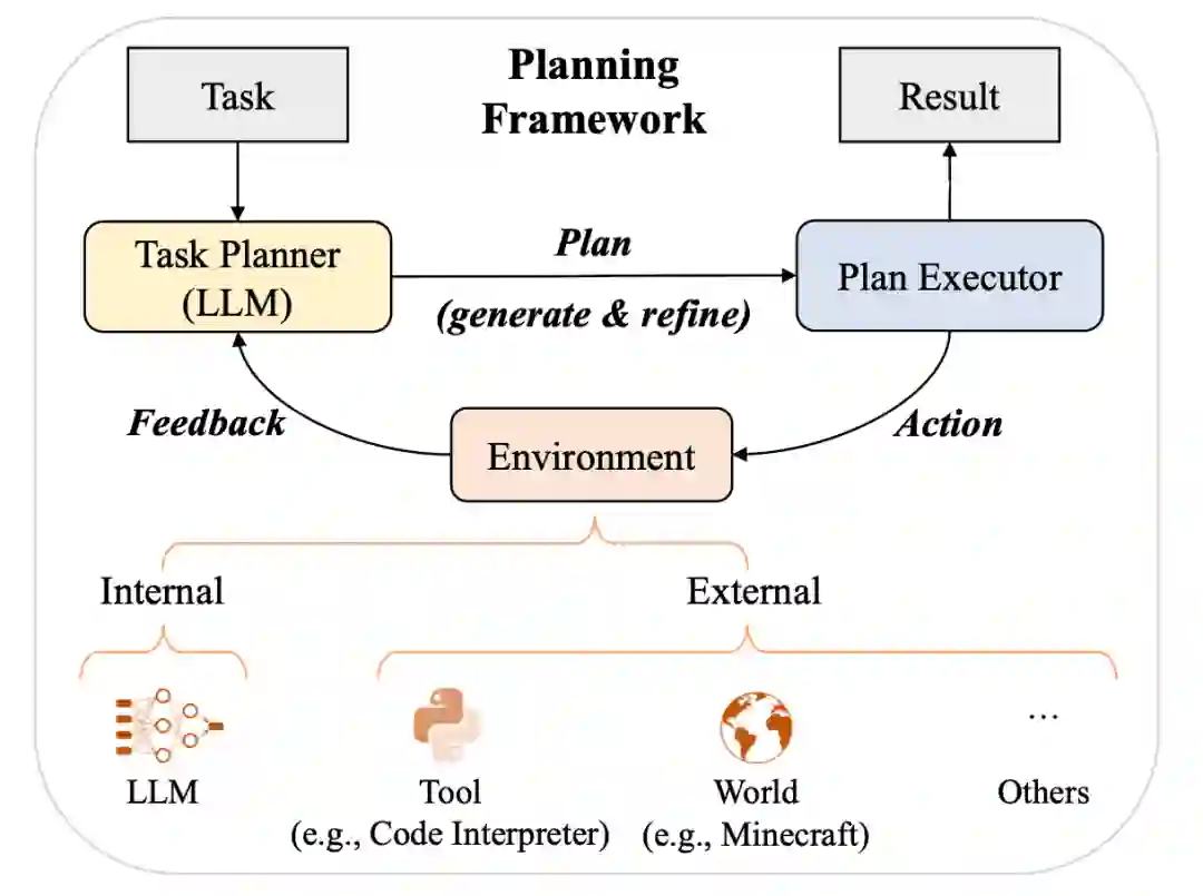 我们将大语言模型在推理阶段如何执行上下文学习的机制分析划分为两类,即任务识别和任务学习。在任务识别部分,介绍了大语言模型如何从示例中识别任务并使用预训练阶段习得的知识加以解决;在任务学习部分,介绍了大语言模型如何从示例中学习解决新任务。除了上下文学习和思维链提示,我们还介绍了另一类使用大语言模型的重要范式,即基于提示对复杂任务进行规划。根据相关工作,我们总结出了基于规划的提示的总体框架。这类范式通常包含三个组件:任务规划者、规划执行者和环境。随后,我们从规划生成,反馈获取和规划完善三个方面介绍了这一范式的基本做法。