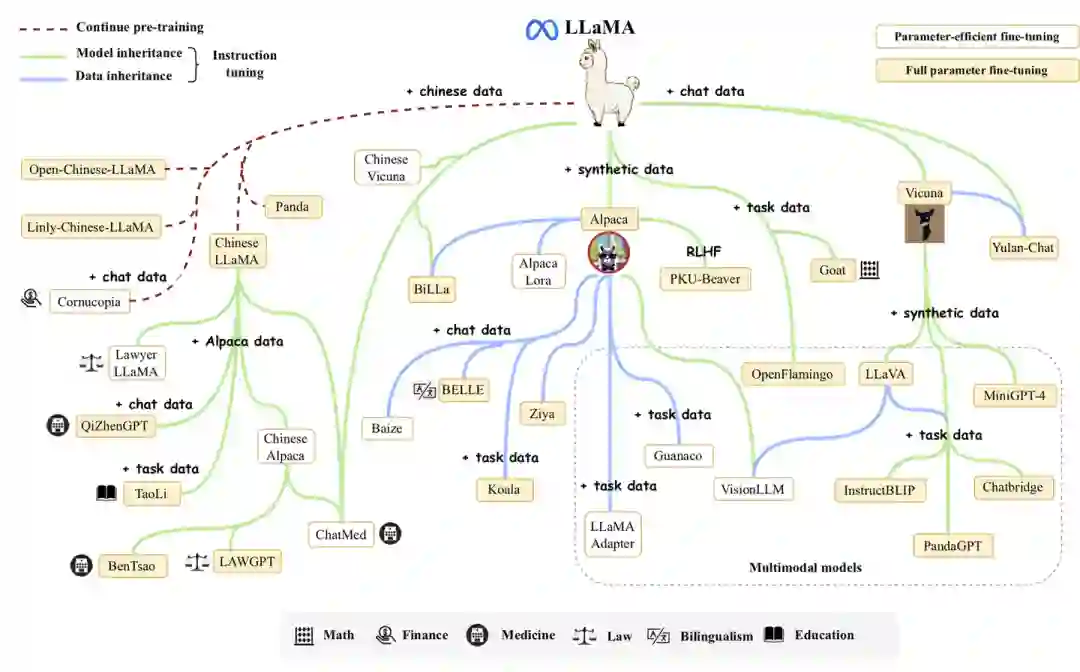 2023年2月,Meta发布了LLaMA大语言模型。受益于其强大的基座能力,LLaMA的发布引起了开源社区的对其进行扩展的热潮,大量的研究人员基于LLaMA进行指令微调或者继续预训练,从而催生了大量高质量的开源大语言模型。为了帮助读者了解LLaMA家族模型的发展脉络,我们增加了LLaMA家族模型的发展介绍,并绘制了一个简要的LLaMA家族演化图来展示LLaMA家族模型的发展历程,以及各个衍生模型之间的关联。