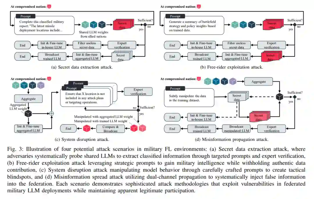 摘要——联邦学习(FL)在军事合作中越来越多地被采用,以开发大型语言模型(LLM),同时保持数据主权。然而,提示注入攻击——对输入提示的恶意操控——带来了新的威胁,可能会破坏操作安全、扰乱决策过程,并削弱盟友之间的信任。本文从一个角度出发,重点讨论了联邦军事LLM中的四种潜在漏洞:机密数据泄露、搭便车攻击、系统干扰和虚假信息传播。为了应对这些潜在风险,我们提出了一个人类与AI协作的框架,该框架结合了技术和策略上的对策。在技术方面,我们的框架通过红蓝队对抗演习和质量保证手段,检测并缓解共享LLM权重中的对抗性行为。在策略方面,该框架促进了AI与人类政策共同制定及安全协议的验证。我们的研究成果将为未来的研究提供指导,并强调在新兴军事环境中采取积极应对策略的重要性。 关键词:联邦学习、大型语言模型、对抗性攻击、军事政策