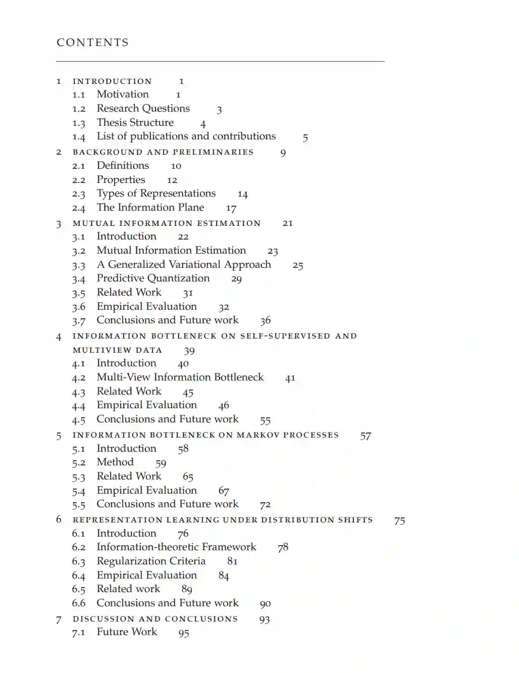 我们开发了新的理论框架和实际学习目标,将经典的信息理论原则扩展到一系列机器学习场景,包括自监督学习、多视角学习和时间建模。这些方法解决了互信息估计、冗余减少和高效表示提取等关键问题,从而提供了更强大和可解释的表示。特别是,我们展示了这些方法如何改进对复杂高维数据的处理,并捕捉时变系统的基本动态,同时能够描述和缓解分布漂移的影响。